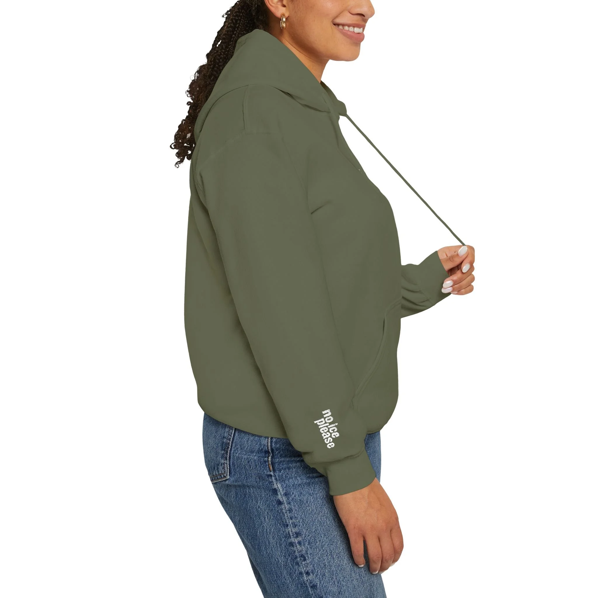 Shine Light, No Ice Please hoodie. Soft, warm, and quietly bold — this hooded sweatshirt carries a small, spirited graphic that reads “shine bright” with a tiny illustrated ice cube, being melted/softened by a candle, beside the lettering. The right sleeve has "no ice please" embroidered on it. The subtle chest placement keeps the message low-key and wearable every day, while the roomy pouch pocket and double-lined hood make it a go-to for cool morning walks, late-night study sessions, or cozying up with friends around a fire. It feels lived-in from the first wear: substantial enough to block a chill, but soft against skin.